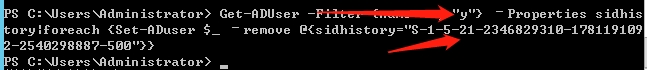 PS>Get-ADUser -Filter {name -eq "y"} –Properties sidhistory|foreach {Set-ADuser $_ –remove @{sidhistory="S-1-5-21-2346829310-1781191092-2540298887-500"}}