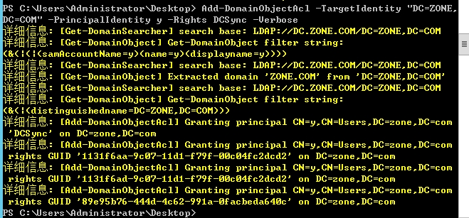 >Add-DomainObjectAcl -TargetIdentity "DC=ZONE,DC=COM" -PrincipalIdentity 域内用户 -Rights DCSync -Verbose