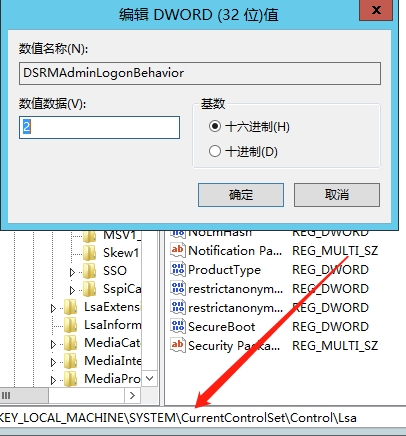 >reg add HKLM\System\CurrentControlSet\Control\Lsa /v DSRMAdminLogonBehavior /t REG_DWORD /d 2