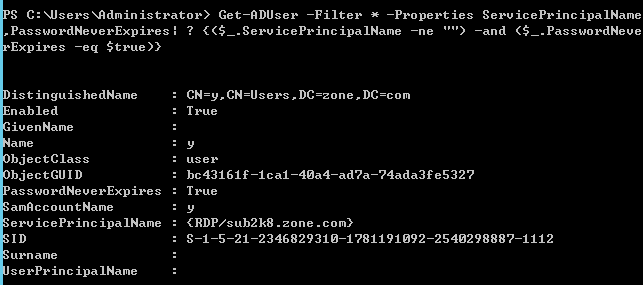 >Get-ADUser -Filter * -Properties ServicePrincipalName,PasswordNeverExpires| ? {($_.ServicePrincipalName -ne "") -and ($_.PasswordNeverExpires -eq $true)}