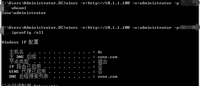 >winrs -r:http://10.1.1.100 -u:administrator -p:password ipconfig /all