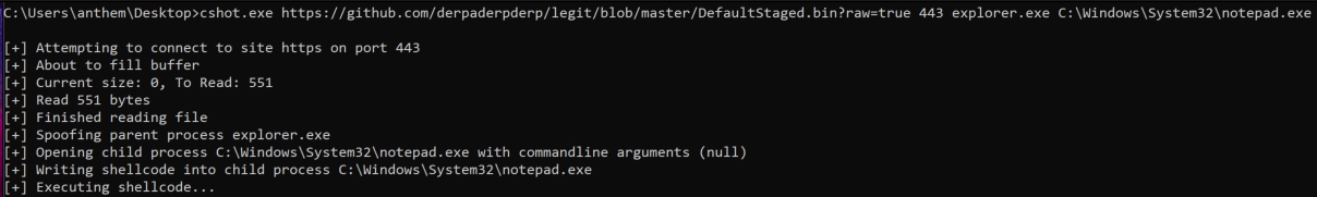 使用C_Shot之类的工具的好处是,我们要执行的恶意代码没有存储在二进制文件中,而是从远程位置检索,读入内存然后执行。这有助于使诸如C_Shot之类的工具对AV / EDR显得相当友好,并且不会被发现。