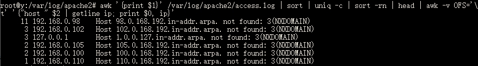 awk '{print $1}' /var/log/apache2/access.log | sort | uniq -c | sort -rn | head | awk -v OFS='\t' '{"host " $2 | getline ip; print $0, ip}'