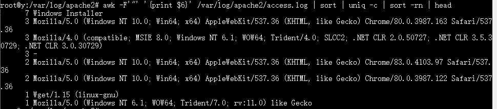 awk -F'"' '{print $6}' /var/log/apache2/access.log | sort | uniq -c | sort -rn | head