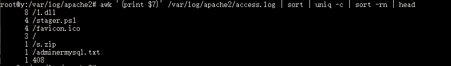 awk '{print $7}' /var/log/apache2/access.log | sort | uniq -c | sort -rn | head